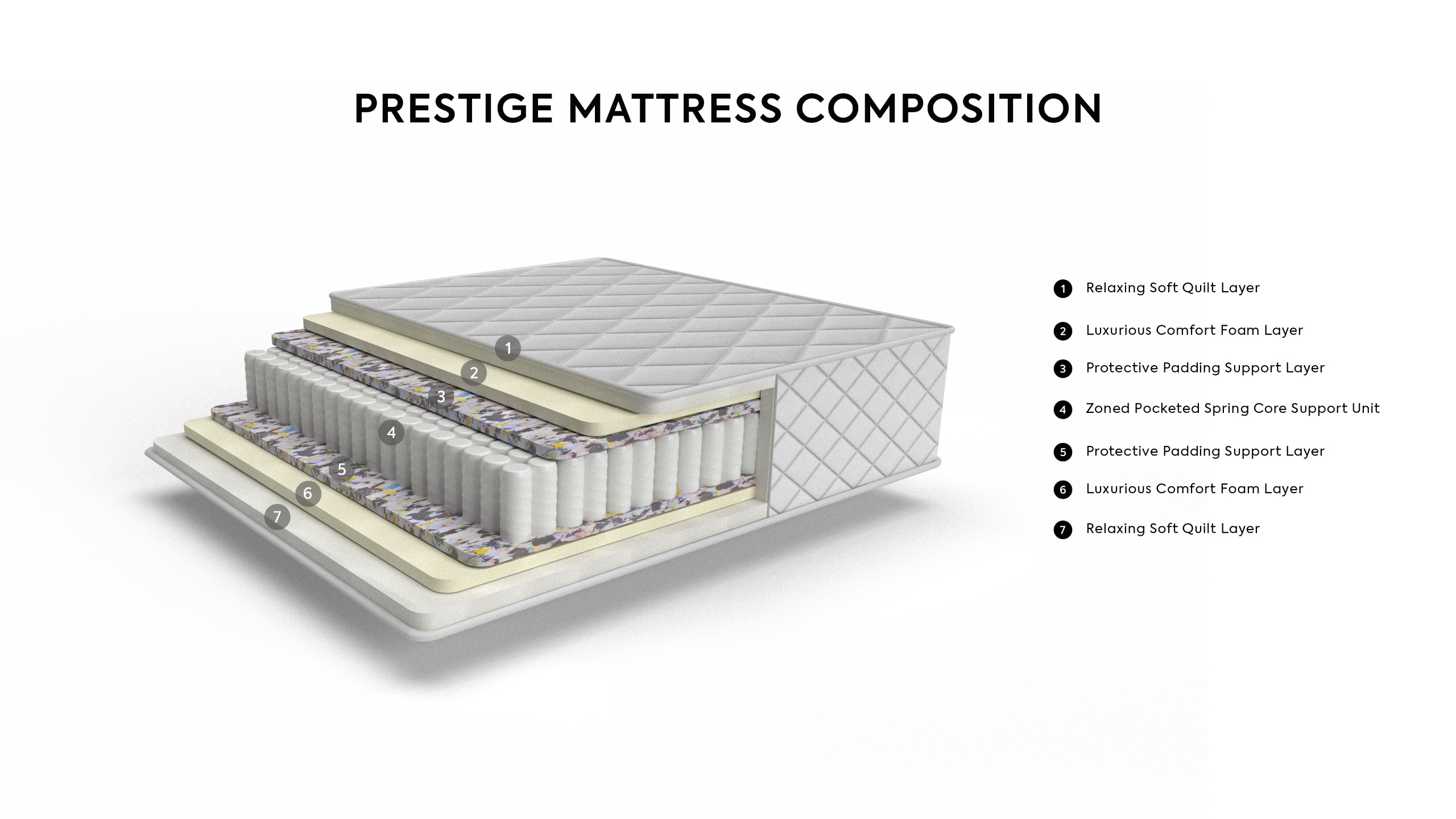 The Prestige Pocketed Spring Mattress is a premium mattress meticulously tailored with consolidated British Standard soft pocketed springs as a core unit that mold to your body’s contours at the highest precision while being padded with 110 Extra High Density Bonded foam to provide a firmer support. A layer of High Resilience foam adds comfort while the Pillow Top quilt provides luxury and shock absorption.